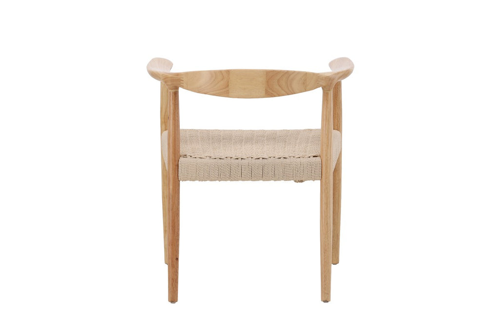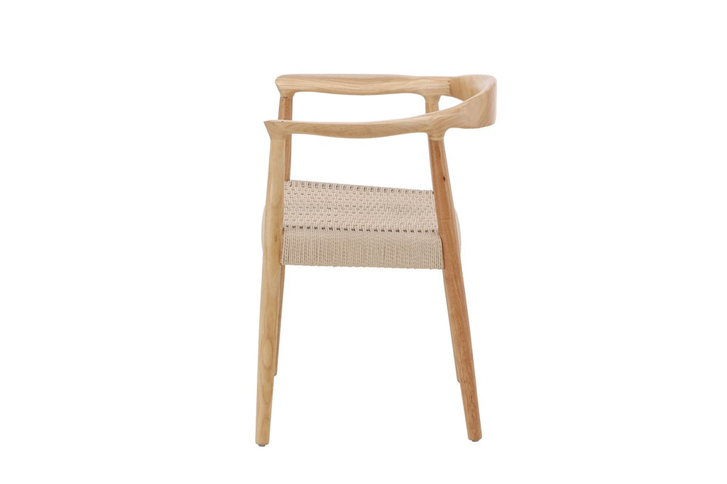 Maak kennis met Havana, een elegante en uitnodigende stoel. Het frame is gemaakt van rubberhout en de zitting is gevlochten van beige polyester koord, waardoor klassieke materialen samenkomen met een eigentijds design.