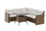 Loungeset Lembe is perfect voor je terras of patio en is gemaakt met aandacht voor comfort en tijdloos design. De loungeset bestaat uit een hoekbank van natuurlijk gekleurd kunststofrotan met 5 zitplaatsen en een hoekdeel, evenals een hogere tafel van kunststofrotan met een glazen tafelblad. De zandkleurige kussens zijn inbegrepen bij de loungeset en dragen bij aan een uitnodigende sfeer.