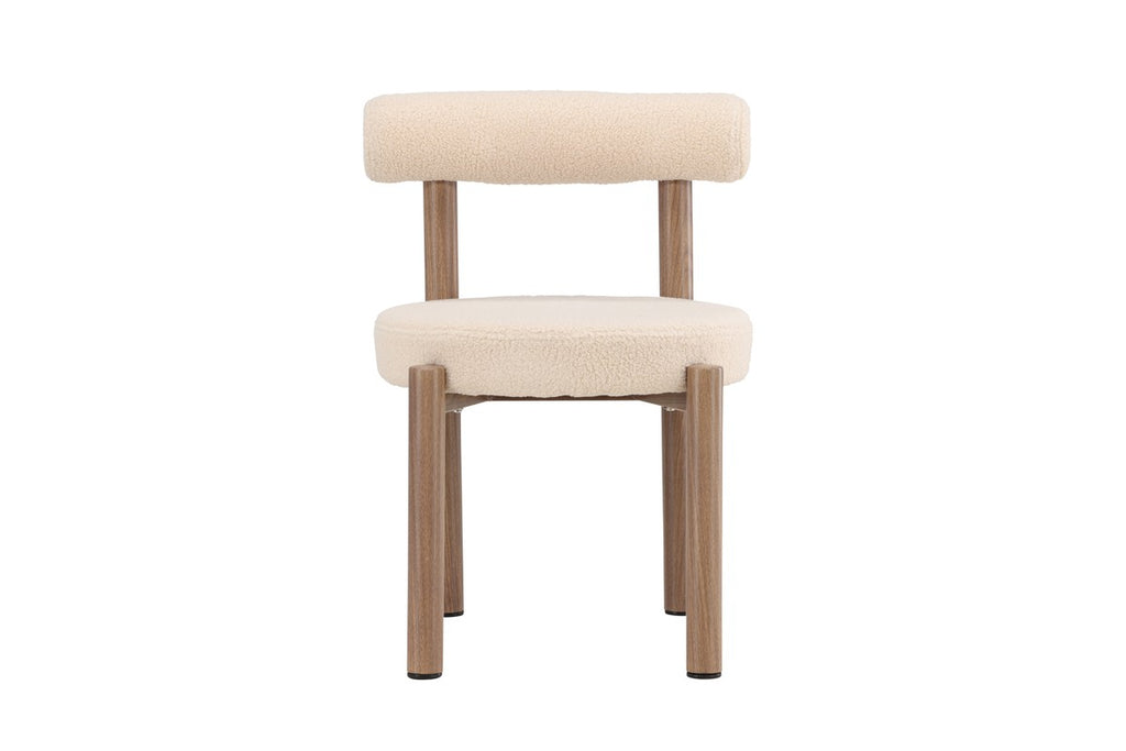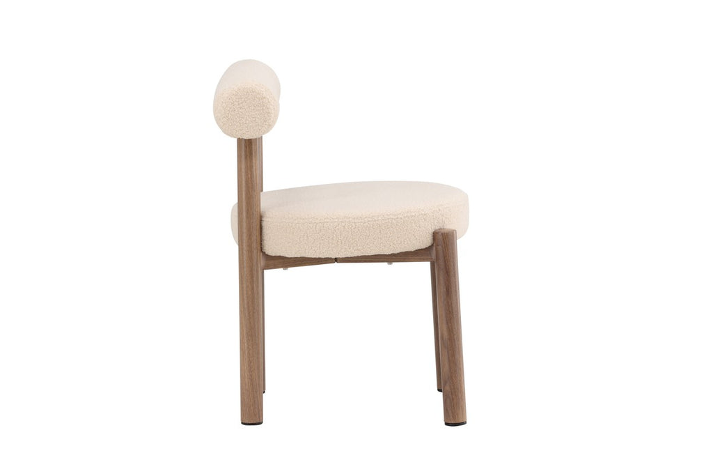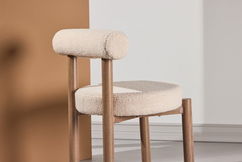 De zitting is bekleed met witte bouclé stof, die met haar zachte, getextureerde oppervlak een warme en uitnodigende sfeer creëert. Dankzij de combinatie van een solide onderstel en een comfortabele zitting is Loïs zowel stijlvol als praktisch – een ideale keuze voor in de keuken of eetkamer.