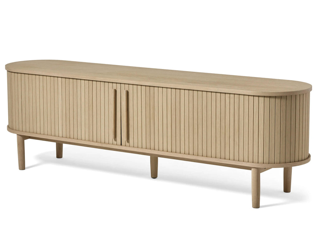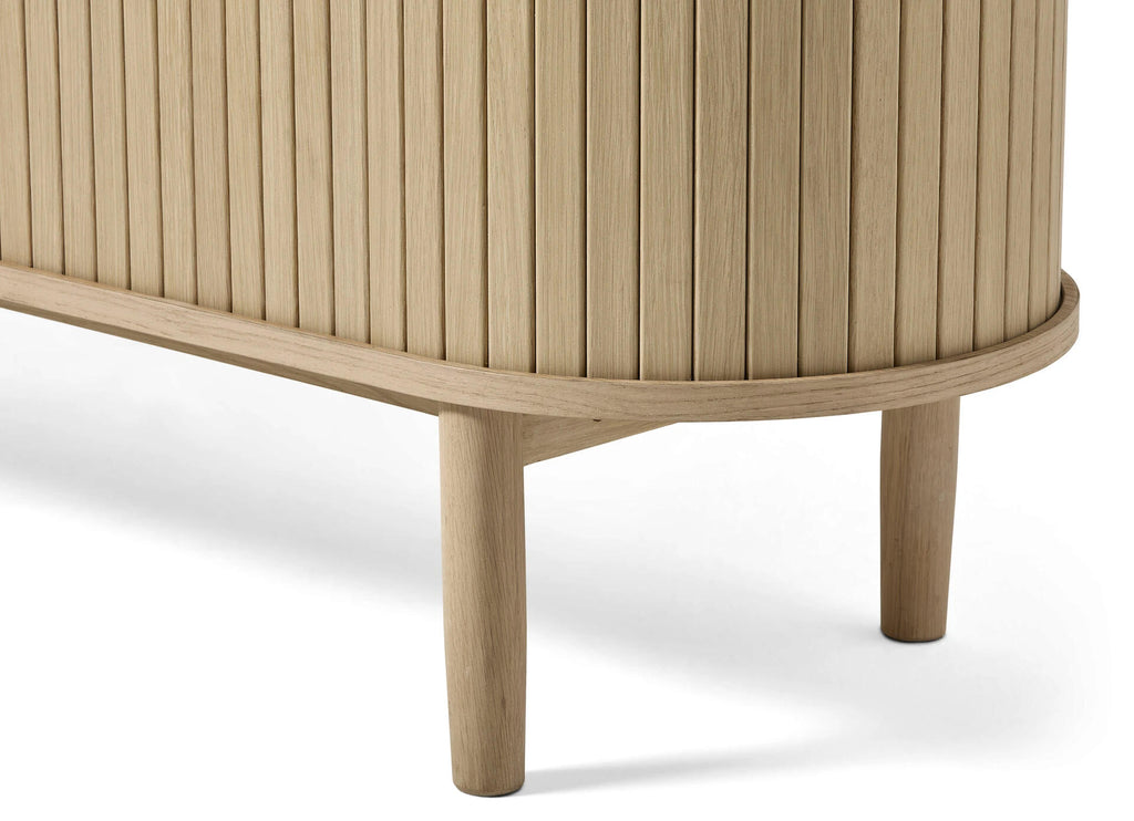 De Skarn salontafel brengt warmte en design samen. De ronde vorm en verticale lamellen geven een zachte, moderne look, terwijl het open vak ideaal is voor kleine items. Een stijlvolle toevoeging aan elke zithoek.